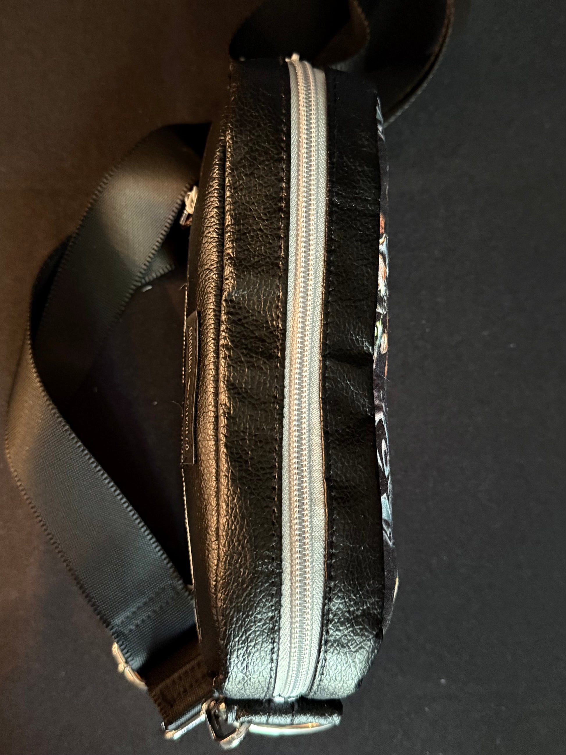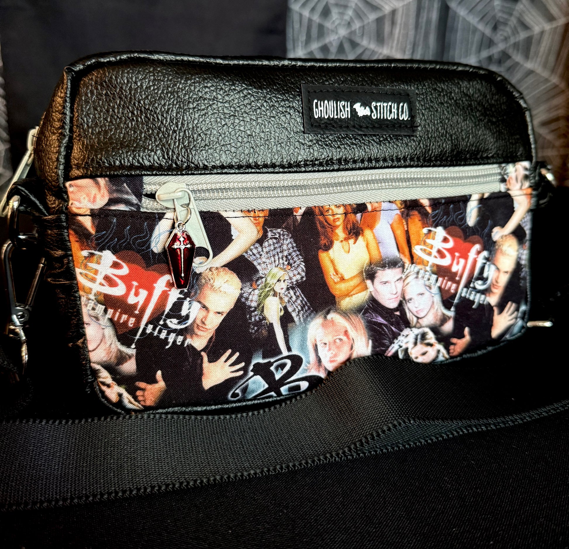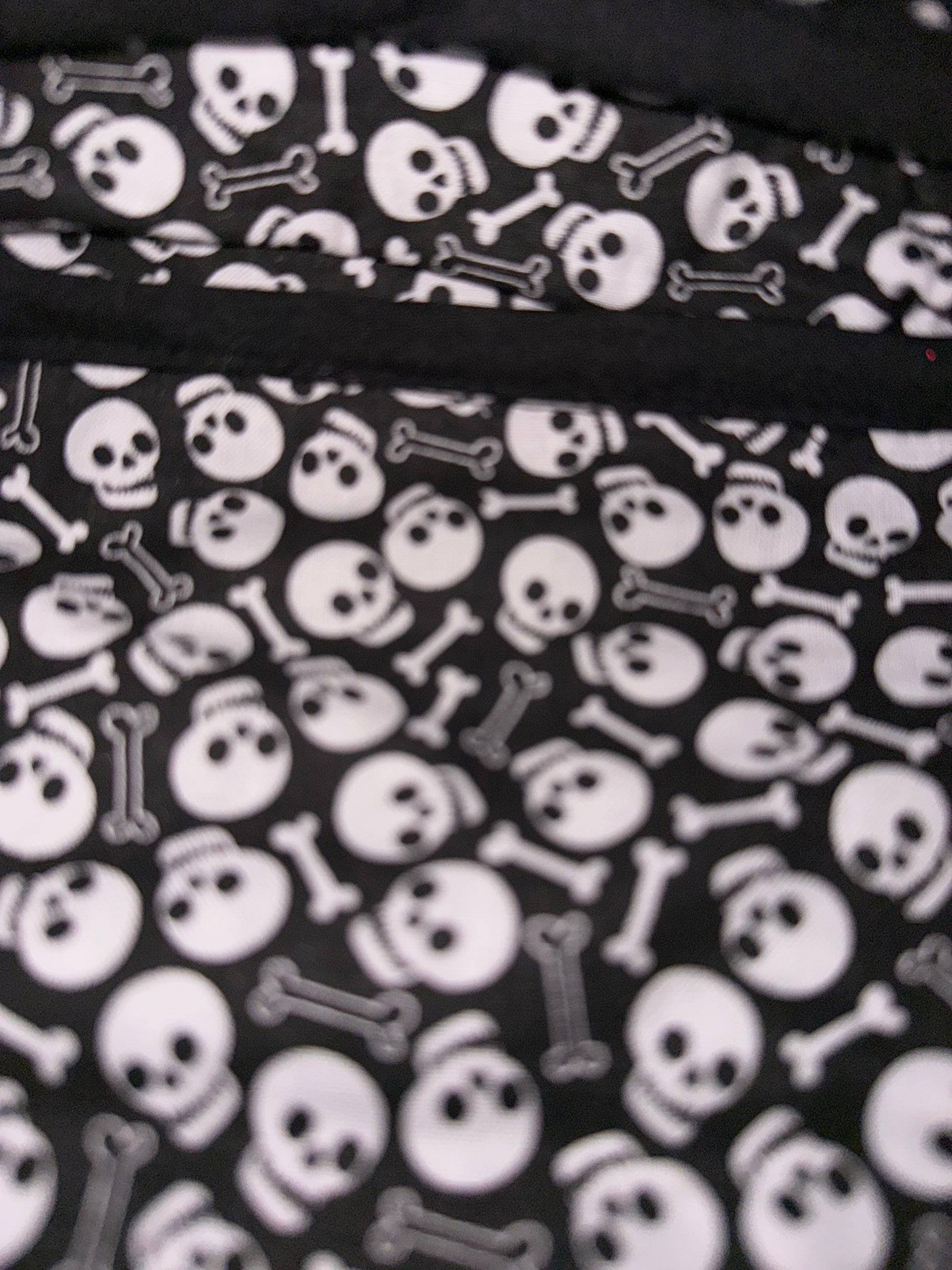 Buffy print. Black textured vinyl “leather”. Lined Black with skull and bones cotton fabric.
