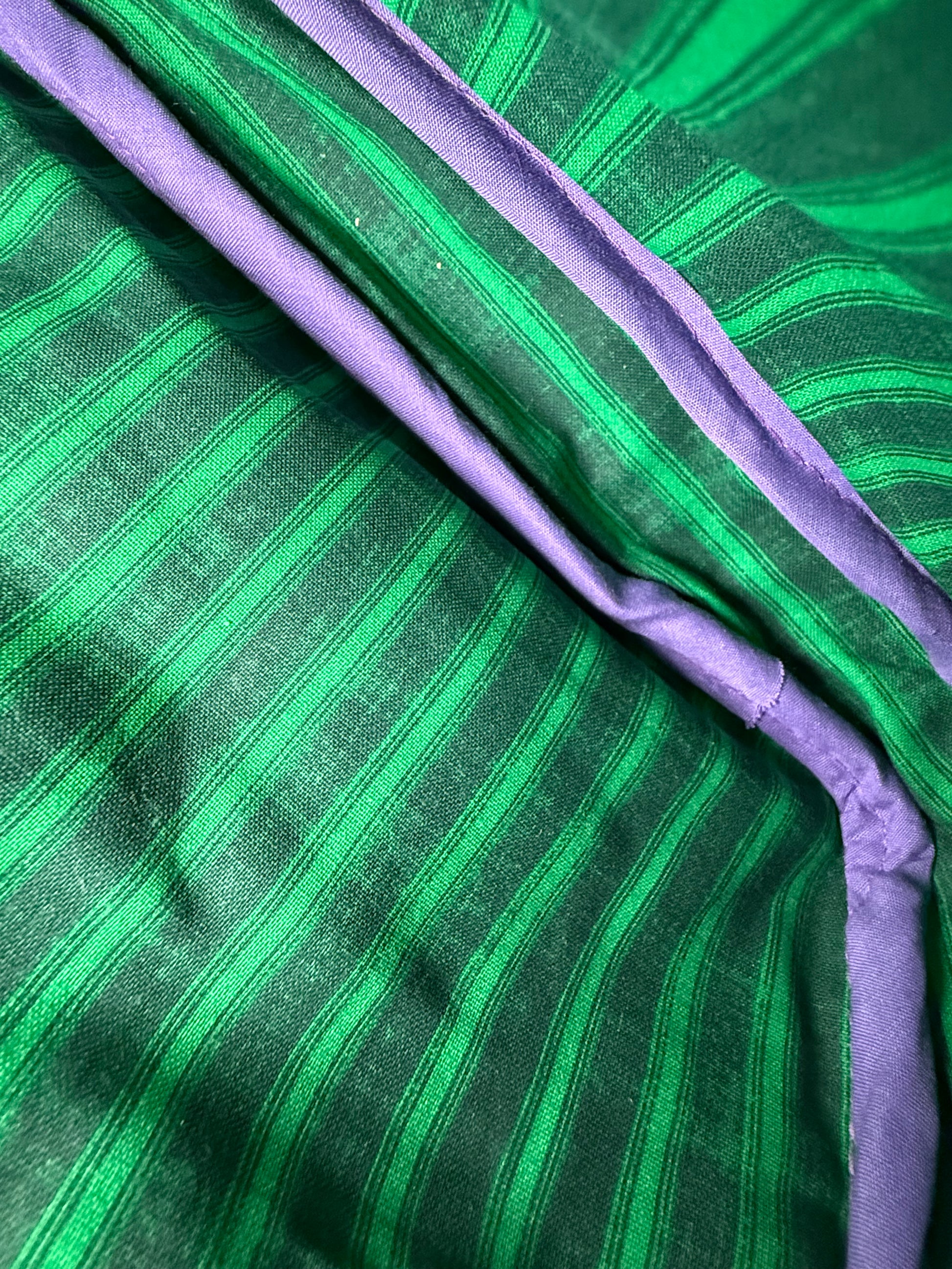 Fortune teller Ghost Mansion print. Deep purple vinyl “leather”. Lined dark and light green striped cotton fabric.
