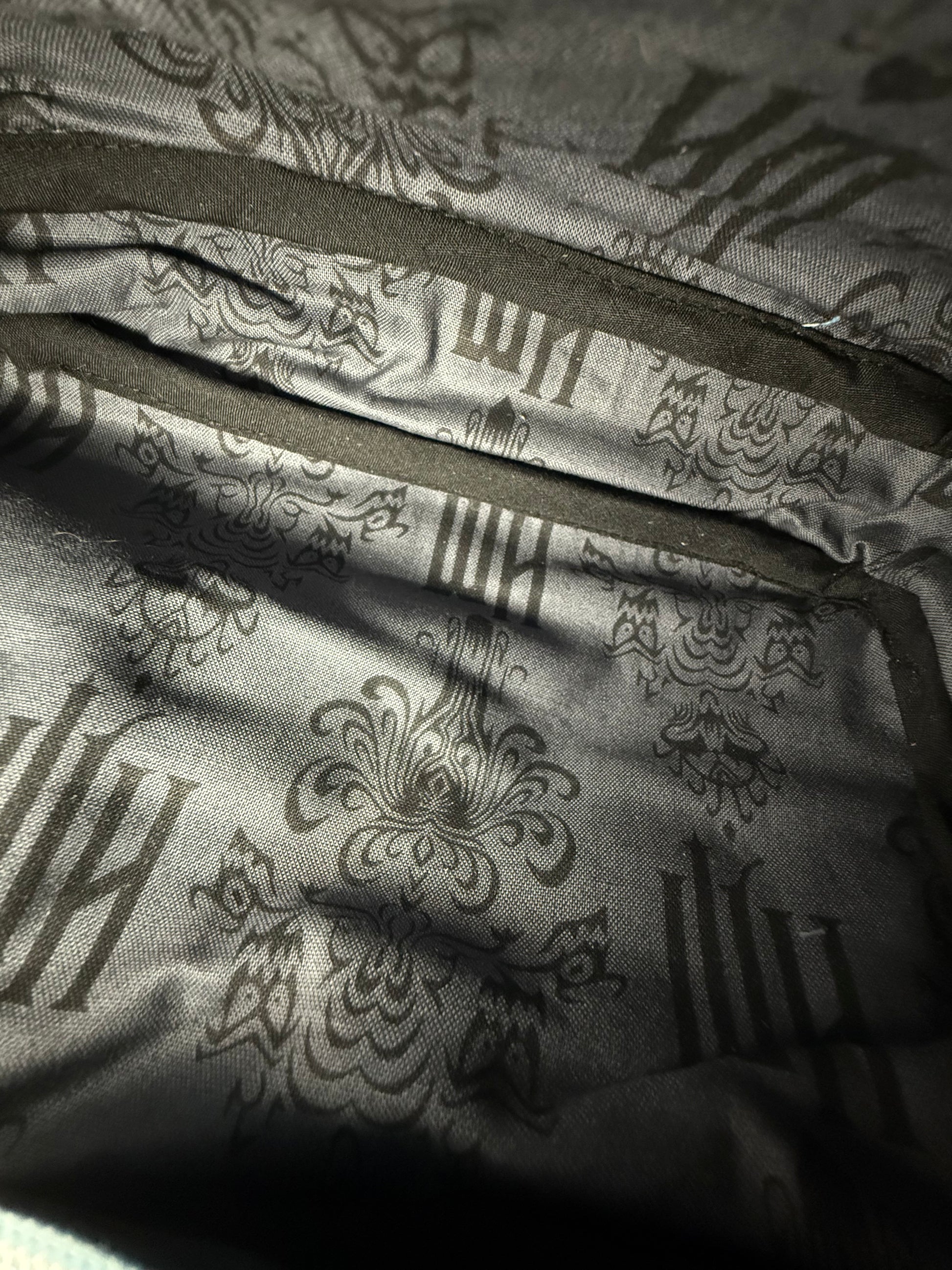 Ghost Mansion Blue print. Grey textured vinyl “leather”. Lined grey with back Ghost Mansion logo fabric.