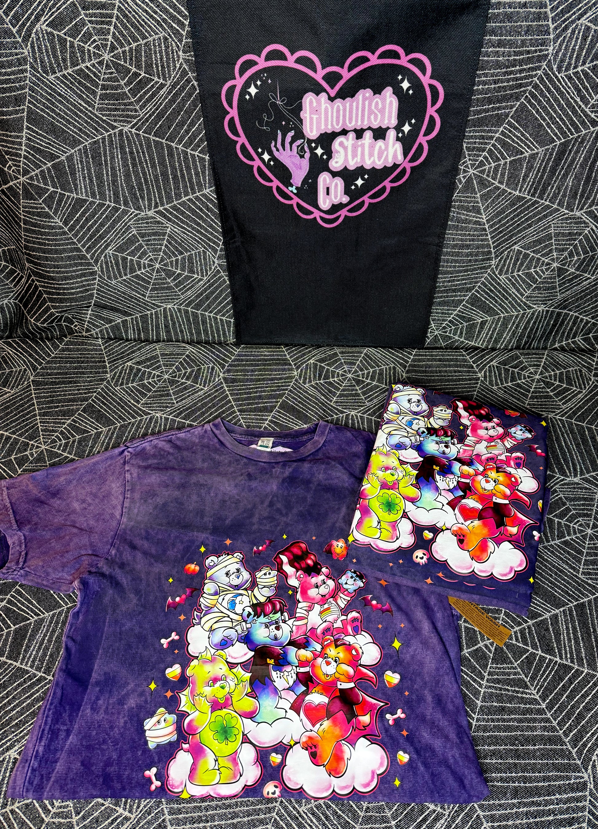 Acid wash deep purple Vintage tee. Featuring Scare Bears in their Halloween best.