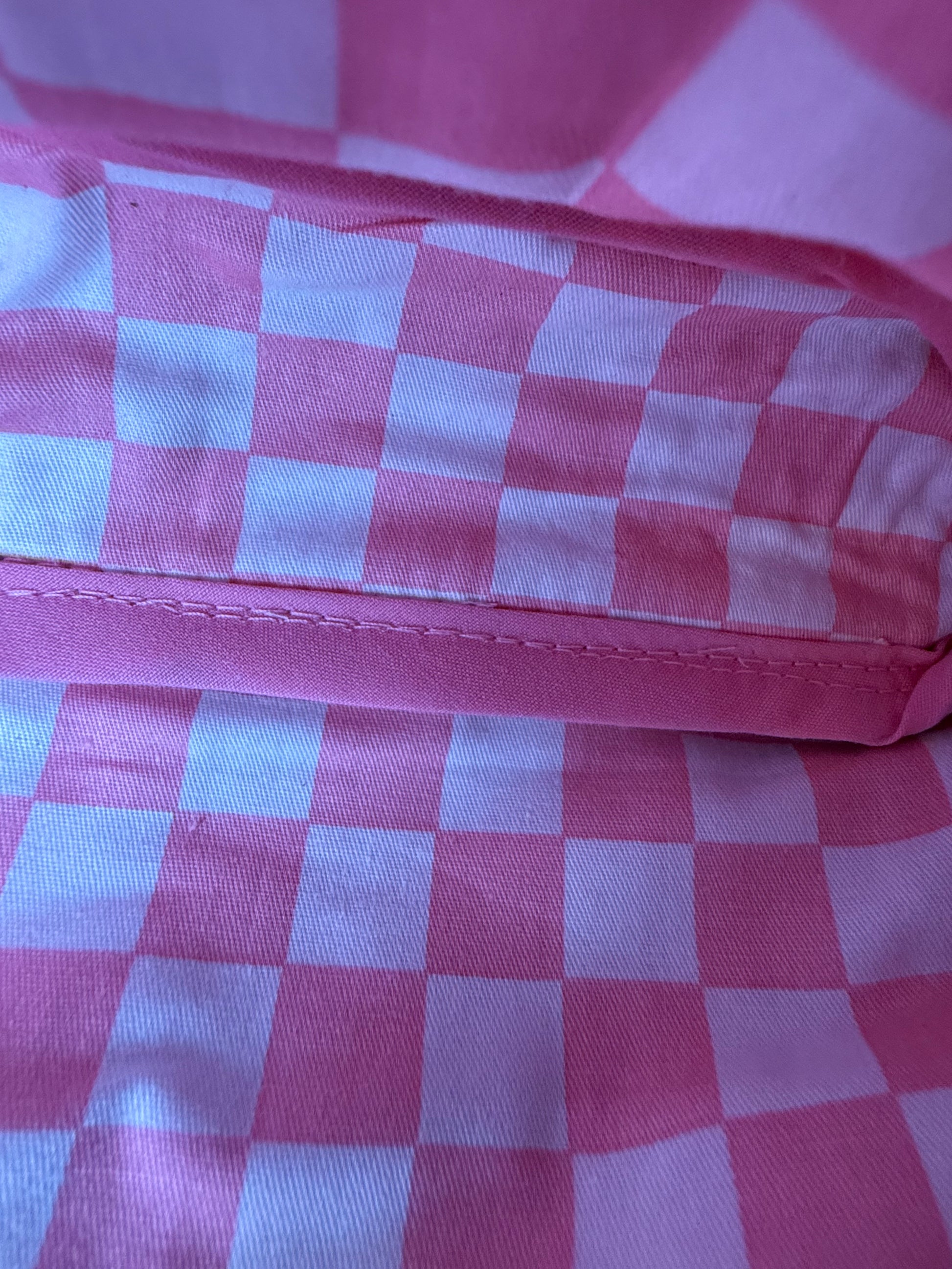 Spooky Mouse treat print. Pink vinyl “leather”. Lined Pink and White checkered cotton fabric.